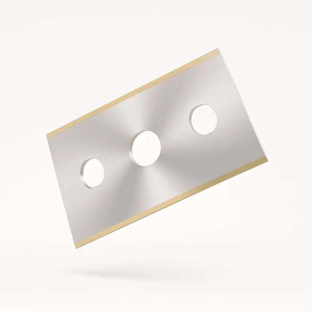 XK-R121 Industrial Razor Blade – 3-hole double edge blade made from tungsten carbide with a Tin (TiN) coating, sized 43 x 22 x 0.20 mm. Durable, sharp, and low-friction, ideal for slitting films, foils, paper, and packaging.