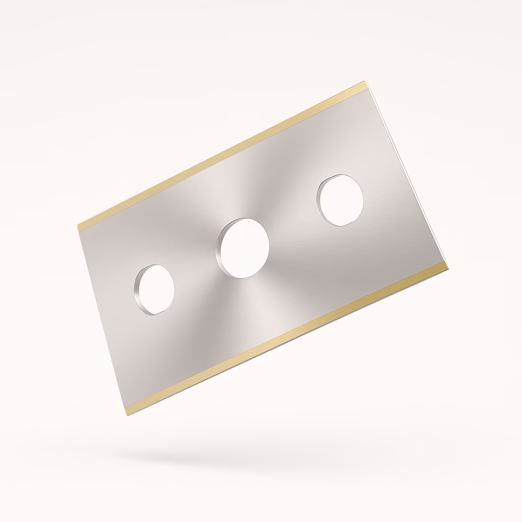 XK-R121 Industrial Razor Blade – 3-hole double edge blade made from tungsten carbide with a Tin (TiN) coating, sized 43 x 22 x 0.20 mm. Durable, sharp, and low-friction, ideal for slitting films, foils, paper, and packaging.